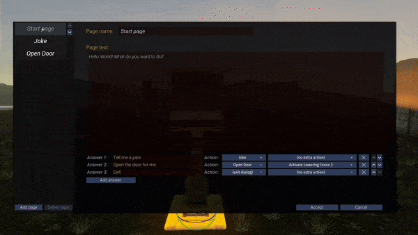 This program has three pages, a "Start page" which introduces the player, a page which tells a joke, and a page which prints "Opening the door...". You can see that the answer option to open the door does switch to the "Open Door" page, but also activate the linked Lowering Fence as a secondary action. When the player selects that option, the Lowering Fence in the background is opened.
