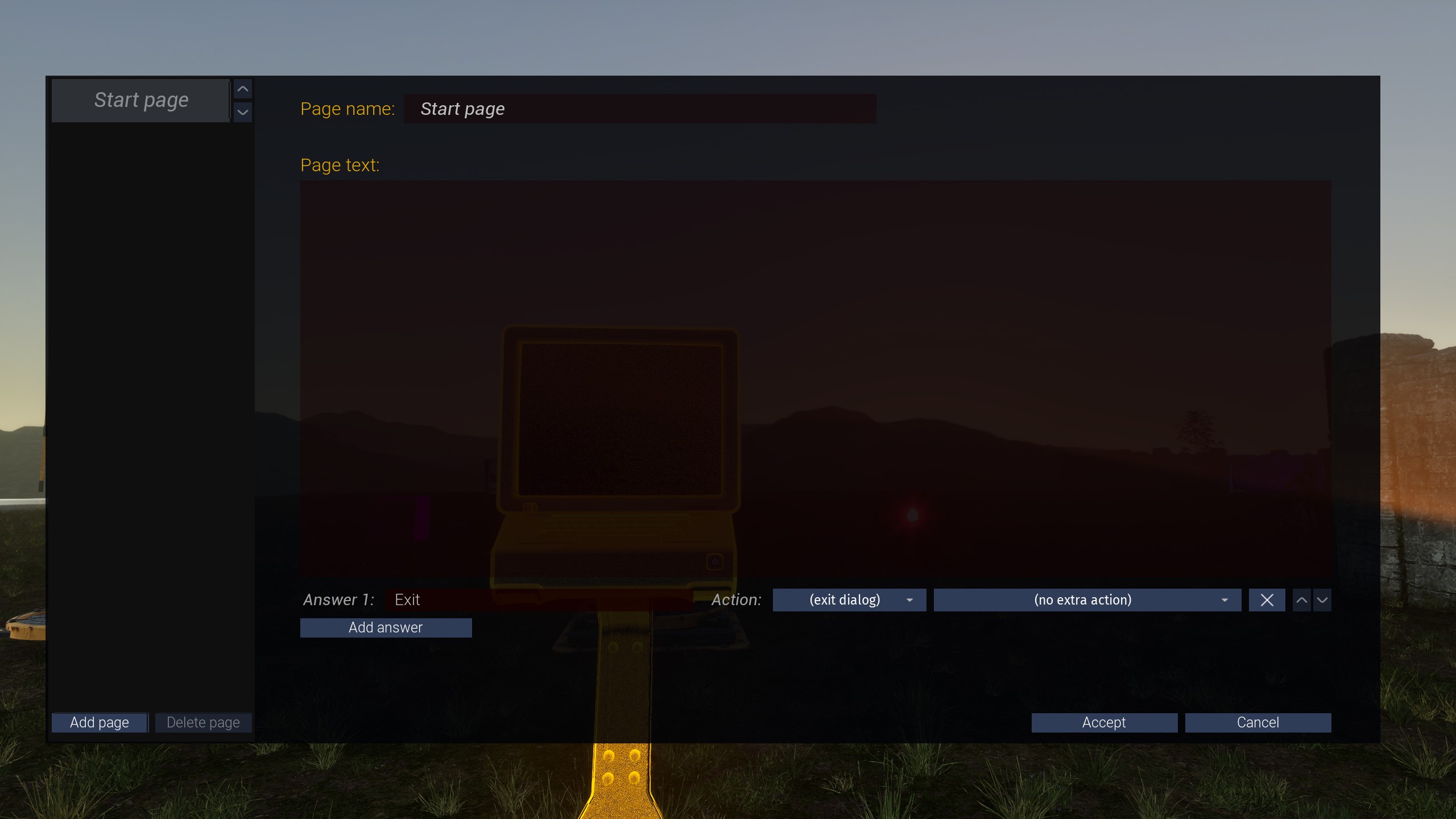 Terminals act upon pages. A Terminal can have multiple pages, where every page can contain some text, together with options (answers) the player can select. Additionally, a page can be marked to be displayed as a document.
