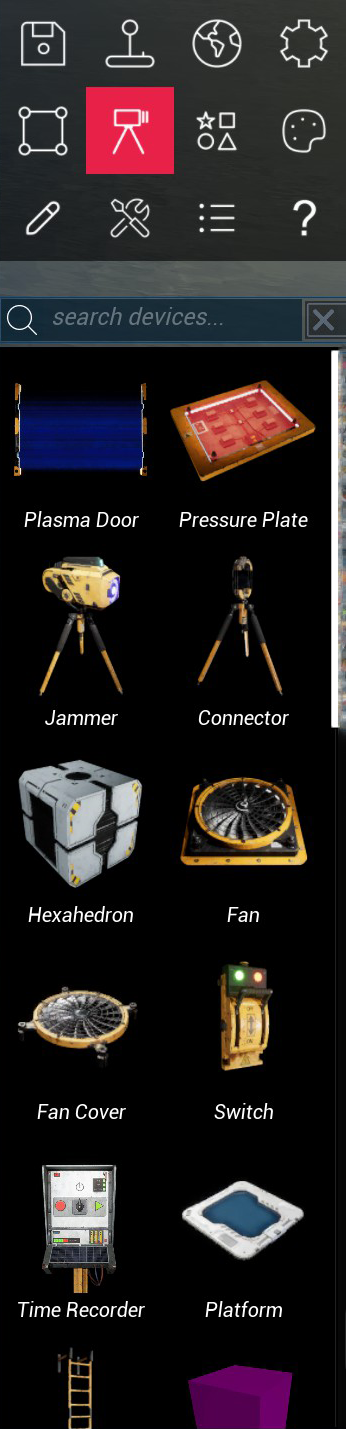 Devices are gameplay elements - the ones you'll often find in The Talos Principle puzzles, such as Plasma Doors, Jammers or Pressure Plates. You will use these a lot to craft your actual puzzles.