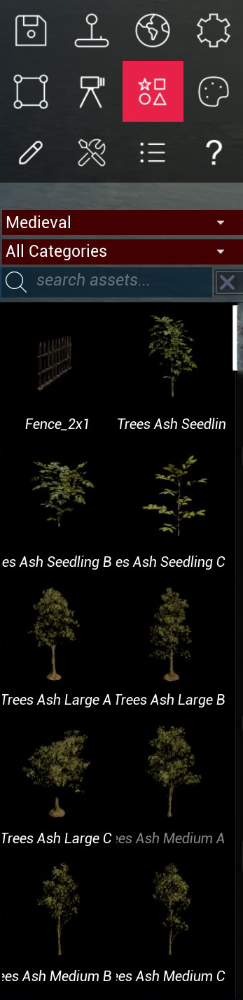 Meshes however have a purely visual nature. They're grouped into themes (Egypt, Rome, Medieval, Wood, Metal) and categories (Walls, Windows, Fences, Decorations, etc.).