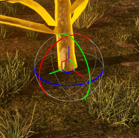 Using the three rotation handles will alter the actor's rotation heading (around the Z-axis, blue), pitch (around the Y-axis, green) and bank (around the X-axis, red).