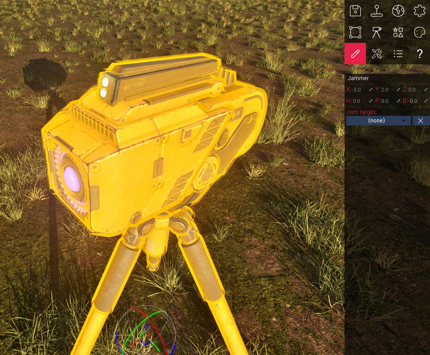 Next to the translation and rotation properties, a jammer can also be set up to jam a specific actor right from the start. Many gameplay actors (devices) therefore have their own set or properties that can be edited to customize their behavior.
